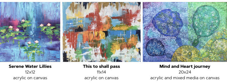 Umuayal Annamalai is an abstract expressionist and mixed media artist. She creates visual interpretations of her inner journey towards self-discovery. Through her art, Umuayal also explores how she connects with her authentic inner-self and the outer world. She believes that all life is connected, and she find ways to depict that synergy in her art.